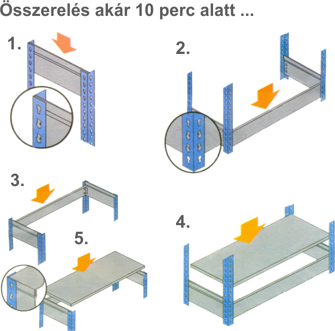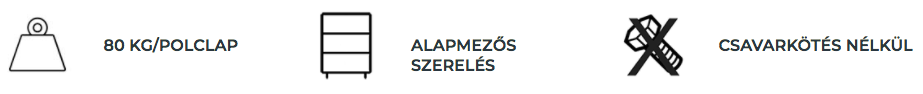 Az egységcsomag tartalmazza a lábakat, polcokat, összekötő elemeket, melyek a csavarmentes kapcsolatnak köszönhetően hetővé teszik az állvány összeállítását akár 10 percen belül.
